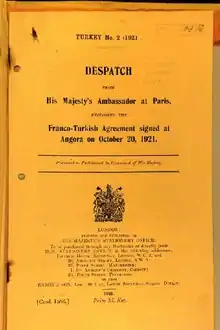 معاهدة أنقرة هي اتفاقية وقعت بين فرنسا وتركيا الأتاتوركية في 20 تشرين الأول عام 1921. وقع المعاهدة الدبلوماسي الفرنسي هنري فرانكلان بويون ووزير الخارجية التركي يوسف كمال. أوقفت المعاهدة الحرب التركية الفرنسية (ضمن حرب الاستقلال التركية) وكان أثرها الأكبر تعديل خط الحدود بين سورية (الواقعة تحت الاحتلال الفرنسي آنذاك) وتركيا الذي كان قد أقر في معاهدة سيفر التي أنهت الحرب العالمية الأولى. رسم الخط الجديد ليبدأ من نقطة تقع إلى الجنوب مباشرة من باياس على خليج إسكندرون ليصل إلى محطة القطار في كلس ويستمر عند الحد الجنوبي لخط سكة حديد اسطنبول - بغداد. أسفرت المعاهدة الجديدة عن وضع السناجق السورية الشمالية ضمن الأراضي التركية وعن عزل مدينة حلب عن معظم المناطق الشمالية التي كانت ضمن ولاية حلب وولاية أضنة. نتيجة لهذه المعاهدة، أمست تحت السيادة التركية المدن والسناجق التالية (من الغرب إلى الشرق): أضنة وعثمانية ومرعش وعينتاب وكلس وأورفة وماردين ونصيبين وجزيرة ابن عمر.[1]