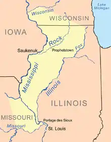بداية من نقطة في نهر ميسوري مقابل مصب نهر غاسكوناد ؛ من هناك في مسار مباشر لنهر جيفريون على مسافة ثلاثين ميلاً من منبعه، وأسفل جيفريون إلى الميسيسيبي ، ومن ثم إلى مصب نهر أويسكونسينغ ونحو ذلك إلى نقطة يجب أن تكون ستة وثلاثين ميلا في خط مباشر من مصب النهر المذكور، ومن هناك بخط مباشر إلى النقطة التي يغادر فيها نهر فوكس (فرع من إلينوي) البحيرة الصغيرة التي تسمى Sakaegan ، ومن ثم أسفل نهر فوكس إلى نهر إلينوي ، ونزولاً على نهر المسيسيبي.