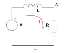 في الدائرة ملف 10 ملي هنري ومقاومة 2و1 كيلو أوم موصلان على التوالي، نحصل على التيار المار في الدائرة: