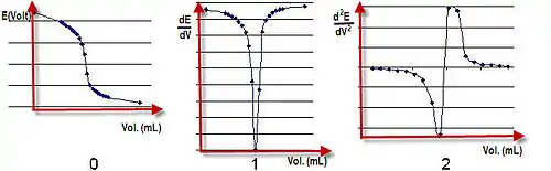 يرسم مخطط بياني للجهد الكهربائي مقابل الحجم المضاف، ويمكن تحديد انتهاء المعايرة بأنها منتصف المسافة للقفزة في الجهد على المخطط.