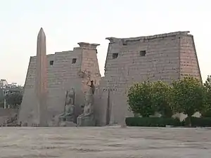 مدخل معبد الأقصر هو البرج الأول بارتفاع 24 متر (79 قدم)، بناه رمسيس الثاني وزين البرج بمشاهد انتصارات رمسيس العسكرية (لا سيما معركة قادش) ؛ كما سجلت انتصارات الفراعنة في وقت لاحق، لا سيما انتصارات الأسرة 25 (السلالة النوبية).