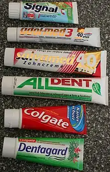 |CitationClass=تم تجاهله (مساعدة) - American Dental Association Description of Toothpaste"Toothpaste". April 15, 2010. مؤرشف من الأصل في 5 مارس 2016. الوسيط