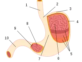 ![]() المعدة وأجزاؤها 1.المريء 2.الفؤاد 3.القاع 4.الغشاء المخاطي 5.الطبقة العضلية 6.طيات معدية 7.الجسم 8.الغار 9.البواب 10.العفج | |