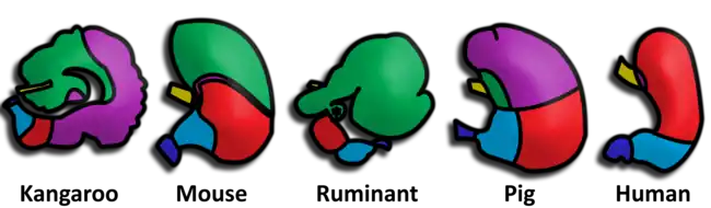 ![]() مقارنة المناطق الغدية في المعدة عند عدة أنواع من الثدييات. قد يختلف تواتر الغدد بشكل أكثر سلاسة بين المناطق عن المخطط هنا. تمثل علامة النجمة في الشكل (عند المجتر (بالإنجليزية: ruminant)) "القِبَة أو أمُّ التَّلافِيْف، أي الكرش الثالثة للمجترات"، وهي غائبة في ساديات الأقدام (بالإنجليزية: Tylopoda) (يوجد أيضاً في ساديات الأقدام بعض الغدد الفؤادية التي تفتح على القلنسوة والكرش[48]). كما يوجد العديد من الاختلافات الأخرى بين الثدييات.[49][50] |