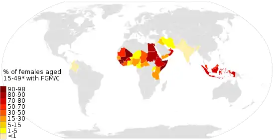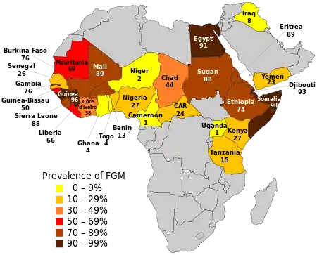 على الرغم من اختلاف تقديرات انتشار تشويه الأعضاء التناسلية الأنثوية، فقد وجدت المصادر باستمرار أن الممارسة التي تخضع لها أغلبية النساء في القرن الإفريقي، في دول غرب إفريقيا من غينيا وسيراليون وغامبيا وموريتانيا ومالي وبوركينا فاسو، وكذلك في السودان ومصر. من بين هذه الدول، جميع الدول لديها قوانين أو مراسيم ضد هذه الممارسة، باستثناء سيراليون ومالي وبعض الولايات السودانية. [39][40]