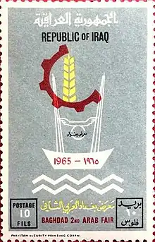 طابع بريدي عراقي فئة 10 فلوس صدر عام 1965 بمناسبة معرض بغداد الدولي الثاني
