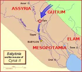 المعركة وقعت في مدينة أوبيس المطلة على نهر دجلة والتي تبعد حوالي 80 كلم شمال شرق مدينة بابل عاصمة الإمبراطورية. يصف المؤرخ اليوناني زينوفون بوجود جسر في مدينة أوبيس.[1][2] هناك احتمال أنه أثناء المعركة قام الفرس قاموا بتخفيض مياه نهر دجلة حيث كانت عندها بأخفض مستوياتها في الخريف مما سهل عليهم عبور النهر.[3] أوبيس كانت موقع إستراتيجي مهم فنقصان مستوى النهر مكن الفرس من تجنب عقبة الجدار الميدي الذي بناه نبوخذ نصر الثاني في وقت سابق وليصل بعدها إلى العاصمة.[4]