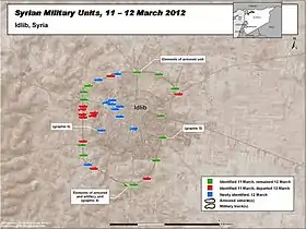 |CitationClass=تم تجاهله (مساعدة)صيانة CS1: BOT: original-url status unknown (link) - الجيش السوري يسيطر بشكل كامل على مدينة ادلب بعد انسحاب الجيش الحر. قناة فرانس24. تاريخ النشر: 13-03-2012. تاريخ الولوج: 14-03-2012. نسخة محفوظة 26 يناير 2020 على موقع واي باك مشين.