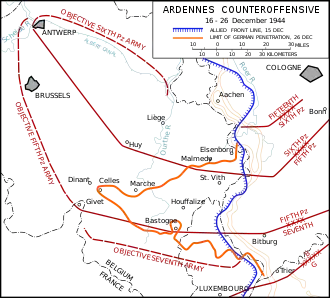 الخط الأزرق يبين وضع الحلفاء يوم 15 ديسمبر 1944 (قبل المعركة)