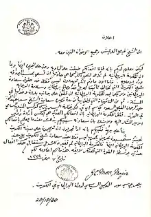 | بسم الله الرحمن الرحيم من فيصل بن سلطان الدويش إلي جناب اليمام (الإمام) المكرم عبد العزيز بن عبدالرحمن الفيصل وفقنا الله واياه لما يحبه ويرضاه آمين. سلام عليكم ورحمة الله وبركاته ، وموجب الخط ابلاغ السلام والسؤال عن احوالكم ، أحوالنا بحمد الله على ما تحبون بعد ذلك نعرفكم أنه بعد ما جانا خبر مغزا دعيج (الصباح) فزعنا وعقب جانا خبر خذلان الله له تطلق منه غزوان وأكان (أغار) ابن طوالة على أهل اللهابة وأكان ابن ماجد على أهل رماح وأكان كران على الشباك وقومه، وكلهم أخذو دبش. وحطينا مغزانا مطلاب ولا قسم الله اننا نوافقهم وحنا نقص جرة البل (نتتبع أثر الأبل المنهوبة) وردنا الصبيحية والبل (الأبل) الماخوذة وردت الجهراء وأقامنا على الصبيحية يوم (واحد) مقصدنا نبي غدي الله يظهر لنا أباعرهم نغير عليها لأن حنا ما ظنينا أن فينا نطحة لموازاة ابن صباح وأهل الجهراء لأنهم أولا واجد (كثيرو العدد) وثانيا في قصور(اي متحصنين بها). وثورنا (رحلنا) من الصبيحية ونوخنا (نزلنا) عند ارحيه ، وروحنا لنا سبور وواجهت خيل لابن صباح وثورنا من ارحيه قصدنا ننوخ وراء الجهراء ايلا ما تجينا أباعرهم. ويوم ظهرنا (حينما غادرنا) ايلا حنا زولهم زولنا (وجهناهم وجها لوجه) موجب كثرهم وقلنا (بسبب كثرتهم وقلتنا) وايلا معاد لنا حيلة إن جنبناهم ركبوا ظهورنا وعورونا وان جيناهم ايلا هو مشكل ناس كثير وفي جدران ونشب الطراد بين خيلنا وخيلهم ونوخنا ودرجنا عليهم. والله يا عبدالعزيز ما لنا قصد إلا نكافي دون اعمارنا والا ما هقينا (لم نتوقع) أن هالأمر يصير الله كريم. وعقب ما درجنا وثارت البندق والله ينزع عنهم يده ويكسرهم وركضون الاخوان ايلا ما طمروا (إلى أن قفزوا) في القصور ويعينا الله عليهم وياخذهم الله ويزيحهم ونتولا الجهراء ومن فيها ويزبن ابن صباح بنفسه قصره الحمر هو واللي معه ونقيم في الجهراء يومين ويرسل لنا (ابن صباح) ويطلبنا الأمان على انه صديق صديقك وعدو عدوك ويعاهدنا على ذلك ويطلب منا أننا نشد على الصبيحية وحنا شرطنا عليه أن الصلح على رضاك. بقا بالخاطر إن كان معجبك صلح ابن صباح وتعرف ان بيصمل (يستمر فيه) فالحمد لله وتعرف ما لنا قصد إلا مكافاة شرة يوم بلانا فإن كان لك نية ثانية في الكويت وأطرافه ولا انتب باغي (لا تريد) صلحه فعرفنا واستلحق علينا باقي أهل الأرطاوية ما نبي غيرهم أحد ونكفيك اياه انشا الله (إن شاء الله) هو وكويته وإن كان غير ذلك فحنا نستنظر الدبرة. أما من قبل خدامك الإخوان ذبح منهم ماية (مائة) وصوباهم (والمصابين منهم) مايتين (مائتين) وهم من فضل الله سالمين نرجوا ان الاموات انشاء الله شهداء عن قبل ذبحى ابن صباح وقومه والله يا عبدالعزيز ما ينتقيسون ولا نعطيك جواب عن كثرهم من قلهم حنا حال التاريخ على الصبيحية واصلك طامي بن حبيليص بشير نرجوا من الله ينصر دينه ويعلي كلمته وعجل علينا الرد فيما يقتضيه نظرك (...) 30 محرم 1339 هـ (13 أكتوبر 1920) (ختم فيصل الدوش) |