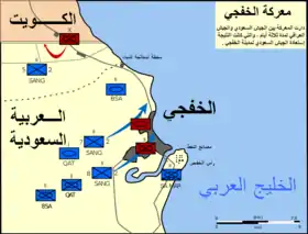 وكان الرئيس العراقي صدام حسين الذي حاول وفشل في سحب قوات التحالف في عمليات أرضية مكلفة من خلال قصف المواقع السعودية وصهاريج تخزين النفط وإطلاق صواريخ سكود على إسرائيل أمر بغزو السعودية من جنوب الكويت. أمرت الفرقة الميكانيكية الأولى والخامسة والشعبة المدرعة الثالثة بإجراء غزو متعدد الجوانب نحو الخفجي مع الاشتباك مع القوات الأمريكية والسعودية والقطرية على طول الخط الساحلي. هاجمت هذه الشعب الثلاث التي تعرضت لأضرار جسيمة من قبل طائرات التحالف في الأيام السابقة في 29 يناير. تم صد معظم هجماتهم من قبل مشاة البحرية الامريكية فضلا عن طائرات الحرس والجنود التابعة للجيش الأمريكي ولكن إحدى الأعمدة العراقية احتلت الخفجى ليلة 29-30 يناير. في الفترة ما بين 30 يناير و1 فبراير حاولت كتيبتين من الحرس الوطني السعودي ومجموعتي دبابات قطرية السيطرة على المدينة بمساعدة من قوات التحالف والمدفعية الأمريكية. بحلول 1 فبراير استعيدت المدينة بعدما قتل 43 من جنود التحالف وجرح 52. بلغ عدد القتلى من الجيش العراقي ما بين 60 و300 قتيل في حين تم أسر 400 شخص.