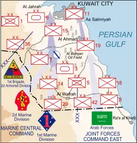 قدر استطلاع لقوات مشاة بحرية الولايات المتحدة أن الجيش العراقي جمع حوالي 60 ألف جندي عبر الحدود بالقرب من مدينة الوفرة الكويتية في 5 أو 6 فرق.[33] تتألف فرق المشاة عادة من ثلاثة ألوية مع وحدة مغاوير مرفقة على الرغم من أن بعض فرق المشاة يمكن أن تصل إلى ثمانية ألوية ولكن معظم فرق المشاة على طول الحدود كانت أقل قوة ويرجع ذلك أساسا إلى الهروب.[34]