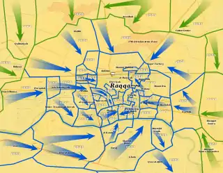 ![]() خريطة لتقدم وسيطرة قسد على الرقة خلال المعركة. سيطرة قوات سوريا الديموقراطية سيطرة داعش | |||||||