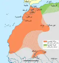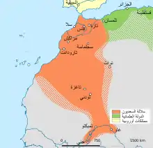 في هذه الأثناء وباتجاه الشمال، كانت الدولة المغربية تحت حكم السعديين في أوج قوتها. في عام 1578، نجح المغرب في صد محاولة قامت بها البرتغال لغزوها وكان ذلك في معركة القصر الكبير، حيث قضت قواته على جيش برتغالي كبير. لكن ومع ذلك، أفرزت النفقات الدفاعية التي خصصت لصد البرتغاليين ضغطا كبيرا على المغرب حيث استنزفت خزائن البلاد وكان المغرب على وشك الإفلاس.