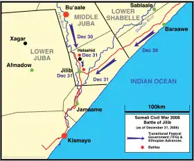 وفي يوم السبت 30 ديسمبر وصلت القوات الإثيوبية وقوات الحكومة الاتحادية الانتقالية إلى مدينة جلب على طريق كيسمايو. وحث شريف شيخ أحمد جنود اتحاد المحاكم الإسلامية على القتال.[5][6]
