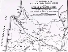 ان معركة مجدو بدأت مع هجوم شنته الإمبراطورية البريطانية المشاة على طول خط متواصل تقريبا من البحر الأبيض المتوسط عبر سهل شارون في سفوح تلال يهودا. هاجموا خط الجبهة العثمانية واستولت على مقر قيادة الجيش الثامن العثماني في مدينة طولكرم، والخنادق في تابسور ومتمحور في عرعرة. وقد التفت الجيش الثامن على الساحل وانتقلت الإمبراطورية البريطانية الفرسان الشمال من خلال الفجوة التي نشأت. الخيالة الصحراء فيلق طوقت قوات المشاة تقريبا في تلال يهودا التقاط خطوطهم الرئيسي لتوريد والاتصالات والتراجع. من قبل 25 سبتمبر، واحدة الجيش العثماني قد دمرت، وما تبقى من اثنين آخرين، كانوا في الشمال تراجع إلى دمشق.