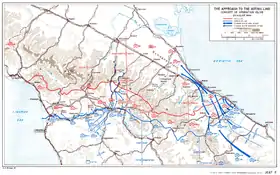 ![]() The initial plan for الخط القوطي, the attempt to break the Gothic Line (red); the planned offensive is shown in blue, along the eastern coast. The arrows converge north of San Marino. | |||||||