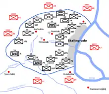 في 23 نوفمبر حوصر داخل المدينة حوالي 250,000 جندي من القوات الألمانية والرومانية ومعهم الفوج 369 الكرواتي إضافة إلى كثير من أفراد القوات المتطوعة من بينهم 35,000 متطوع سوفياتي حاربوا في الجانب الألماني وآلاف الجنود السوفيات الذين أسروا خلال المعارك وحوالي 10,000 من المدنيين. اتساع الجيب المحاصر بلغ من الشمال إلى الجنوب حوالي 30 ميل (48 كلم) ومن الشرق إلى الغرب 25 ميل (40 كلم).[27] الجيش السادس كان مكونا من 21 فرقة ميدانية و100 كتيبة تشكل الفيالق 8، 11 و51 والفيلق 14 بانزر إضافة إلى الفيلق 4 (التابع للجيش الرابع بانزر) الذي وقع في الحصار وتم إلحاقه بالجيش السادس، ليكون تعداد القوات الألمانية المحاصرة حوالي 195,000 فرد. الوضع الجديد اضطر باولوس وجيشه للدفاع من كل الجهات ما ضاعف طول جبهته وزاد متاعبه. لم يقع كل أفراد الجيش السادس في الفخ، 50,000 جندي بقوا خارج الجيب المحاصر. سارع الجيش الأحمر إلى تنصيب خطين دفاعيين، الأول موجه نحو الداخل للدفاع ضد أي محاولة للجيش السادس لكسر الحصار أما الثاني فموجه للخارج من أجل منع أي هجوم ألماني معاكس يهدف إلى توحيد القوات.