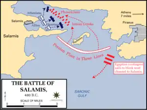 معركة سالاميس هي معركة بحرية وقعت في العام 480 قبل الميلاد بين تحالف من المدن اليونانية القديمة والإمبراطورية الفارسية في إطار الحروب الفارسية اليونانية. جرت المعركة بالقرب من بحر إيجة في مضيق سالاميس بين البر اليونانى وجزيرة سالاميس، وهي جزيرة في خليج سارونيك بالقرب من أثينا. وتمثل هذة المعركة القمة في تاريخ مرحلة الغزو الفارسي الثاني لبلاد الإغريق التي بدأت في عام 480 قبل الميلاد. وفيها تمكن الأثينيون وحلفاؤهم بقيادة ثيمستوكوليس من هزيمة الأسطول الفارسي الضخم (800 مركب) الذي جاء لغزو بلادهم بأسطول صغير (380 مركب).