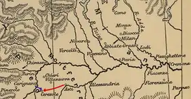 ![]() الحركة قبل المعركة؛ يظهر التقدم الإمبراطوري من آستي باللون الأحمر بينما تقدم إنغين من كارينيانو فهو بالأزرق. | |||||||