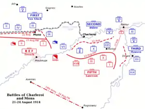 بحلول 20 أغسطس، بدأ الجيش الخامس (بقيادة الجنرال تشارلز لانريزاك) التركيز على جبهة طولها 40 كيلومترًا على طول السامبر تتمركز في شارلروا وتمتد شرقًا حتى حصن نامور البلجيكي. غطى فيلق الفرسان (بقيادة الجنرال أندريه سوردت) الجناح الأيسر للجيش الخامس وقوة المشاة البريطانية (بي إي إف) في مونس. امتلك الفرنسيون 15 فرقة بعد نقل القوات إلى لورين، في مواجهة 18 فرقة ألمانية من الجيش الثاني (الجنرال كارل فون بولو) والجيش الثالث (العقيد ماكس فون هاوسن) الذي تحرك إلى الجهة الجنوب غربية من لوكسمبورغ باتجاه الميوز.