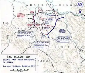 ![]() خريطة تصور الغزو الثالث للإمبراطورية النمساوية المجرية المجرية لصربيا، نوفمبر-ديسمبر 1914 | |||||||||