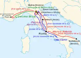![]() Map of the movements of the various legions during the campaigns leading up to the Battle of Mutina | |||||