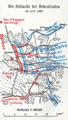 أرشدوك جون أمر جيشه المعنوي في التراجع. تابع مورو ببطء حتى 8 ديسمبر. ثم ، في غضون 15 يومًا ، تقدمت قواته على مسافة 300 كم واستولت على 20.000 نمساويًا.[27] كان جنرال لينج أوف جنرال كلاود لوكوربي قد تجاهل جانبا ريش في روزنهايم في 9 ديسمبر. في سالزبورغ في 14 ديسمبر ، أوقف ال الارشيدوق قبالة ليكوربي في نجاح خلفي.[28] ومع ذلك ، في سلسلة من الإجراءات خلال الأسبوع التالي ، فقد الجيش النمساوي التماسك. تميزت رشيبانزي كثيرا في السعي. في 17 ديسمبر ، عندما قام الأرشيدوق تشارلز بإعفاء شقيقه جون ، كان الجيش النمساوي مجرد رعاع.[29] و وصلت القوات الفرنسية 80 كيلومترا من فيينا ، طلب تشارلز هدنة ، والتي منحت مارسو في 25 ديسمبر. النصر الفرنسي الحاسم في هوهنليندين وضع مورو كمنافس محتمل لنابليون بونابرت.[30]