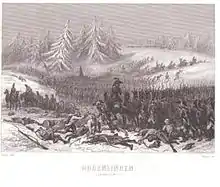 كل الفرق النمساوية بدأت عند الفجر. زحف على طول الطريق السريع في جميع الأحوال الجوية، عاقت فرقة كولوترات على الرغم من الثلوج الكثيفة. في الساعة 7:00 صباحا، اصطدم جراسة المتقدم بقيادة الميجور جنرال فرانز لوبر بالقائد رقم 108 من فرقة المشاة الخطية العقيد بيير - لوي بينيت دي ماركونيريت. و اثر الاصتدام دفاعا عميقا في الغابة، عقد 108 علي أرض الواقع في البداية. ولكن، أرسل اللواء ليليو سبانوتشى كتيبة مدفعية عسكرية في هجوم من جانبه وأدى إلى عودة الفرنسيين. ارتكب كولوترات واللواء البرفار اللواء بيرنهارد ايراسموس فون دروي وكتيبة ثانية من الغريناديين معركة ادت الي استمرار الهجوم.[14]