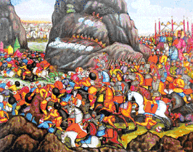 ![]() لوحة للمعركة بين نادر وقوات الصدر الأعظم. في التوضيح، نادر يركب بين قواته. يتم فصل مجموعة منفصلة عن وحدته الفرسان في الجبال ويطلقون النار على العثمانيين بينما تدفعهم قوة نادر الرئيسية. | |||||||||