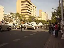 ![]() عناصر من القوات المسلحة وآليات عسكرية في شوارع أورومتشي، عاصمة سنجان | |