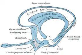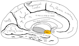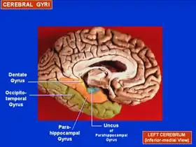![]() الجانب الإنسي من نصف الكرة المخية الأيسر. يظهر المعقف باللون البرتقالي | |