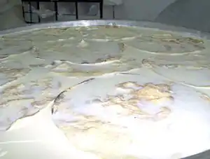 نأتي بكيلو من الحليب الطازج ونضعه بدون غلي داخل صينية عريضة ونتركه لمدة ثمان ساعات تقريباً بمكان معتدل الحرارة فتتشكل طبقة من الدسم على وجه الحليب ثم نأتي برغيف من خبز التنور الساخن ونضع وجهه فوق الحليب فتلتصق طبقة الدسم بالخبز ثم نرفعه ونضعه بصحن ونصب فوقه العسل أو السكر ثم تقطع وتؤكل.