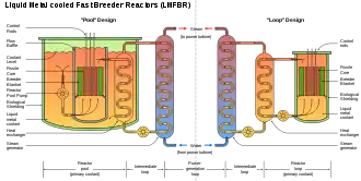 1) طراز الدورة، وفيه يدور الصوديوم في دورة ابتدائية خارج خزان المفاعل ولكنها داخل الحاجز الحيوي للمفاعل biological shield (لأن الصوديوم-24 من العناصر المشعة، ويجب ابتعاد العاملين عنه).