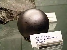 - وفي ألمانيا تشكل في هيئة كرات في حجم كرة التنس تقريبا، توضع تلك الكرات في كومة كبيرة في خزان المفاعل (ولذلك يسمي المفاعل العالي الحرارة في ألمانيا بمفاعل كومة الكرات) Kugelhaufenreaktor .