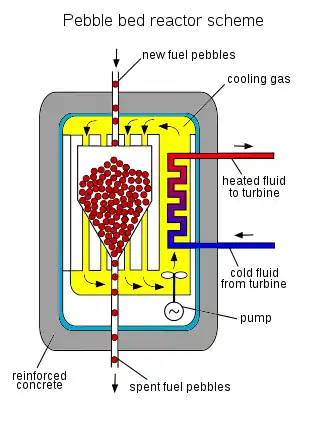 الرسم يوضح تصميم مفاعل الحرارة العالية، كرات الوقود النووي يمكن تزويد المفاعل بها من أعلى مع اتقاء الكرات المستهلة من أسفل. وإذا كان الوقود النووي في الكرات لم يستهلك إلى الحد المطلوب، فهي توجه إلى أعلى وتمون كومة المفاعل من جديد. بذلك توجد ميزة إضافية لمفاعل الحرارة العالية وهي أنه لا يحتاج إلى مخزون كبير من وحدات الوقود كما هو الحال مع مفاعلات الماء الخفيف حيث يوجد لديهم في العادة مخزون يكفي لعام كامل . إلا أن هذا مفاعل الحرارة العالية لا يمكن تشغيله مثل مفاعل كاندو ومفاعل RBMK اللذان يمكنهما إنتاج الكهرباء إلى جانب إنتاج البلوتونيوم-239 أو اليورانيوم-233 الصالحان للصناعة أسلحة نووية.