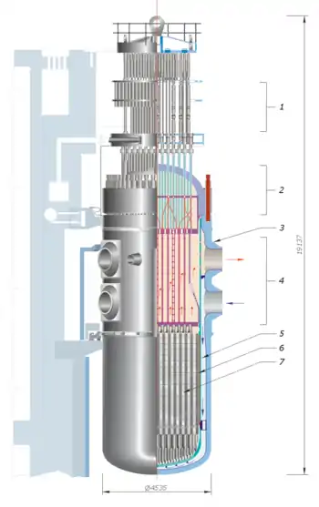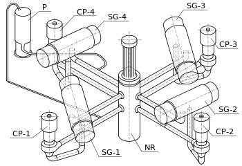 - حاوية المفاعل (مشار إليها بالحروف NR في الرسم): يجري الماء في المساحات البينية بين قضبان الوقود، فيمتص الحرارة الناتجة عن الانشطار النووي وعن الإشعاع النووي