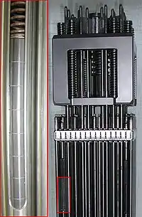 يتم التحكم في سير التفاعلات النووية وبالتالي في إنتاج الطاقة الكهربائية بواسطة قضبان التحكم التي تزج بين وحدات الوقود وتقوم هذه القضبان بتهدئة التفاعلات عن طريق امتصاصها للنيوترونات البطيئة الزائدة. ويتم التحكم في معدل التفاعلات من خلال خفض أو رفع قضبان التحكم في قلب المفاعل.