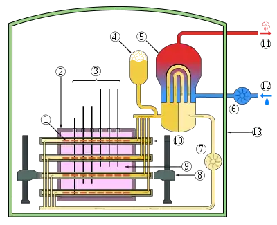 يقوم التفاعل النووي بتوليد حرارة في قلب المفاعل وتعتبر تتك الدورة هي الدورة الابتدائية ذات ضغط مرتفع. ويعمل المبادل الحراري على نقل الحرارة إلى الدورة الثانوية، والتي تقوم بتدوير التوربين المتصل بمولد كهربائي.