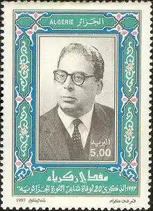 مفدي زكرياء (1908-1977) شاعر الثورة الجزائرية، ومؤلف النشيد الوطني الجزائري «قسما». اسمه الشيخ زكرياء بن سليمان بن يحيى بن الشيخ سليمان بن الحاج عيسى، ولد يوم الجمعة 12 جمادى الأولى 1326 هـ، الموافق لـ 12 يونيو 1908م، ببني يزقن، أحد القصور السبع لوادي مزاب، بغرداية، في جنوب الجزائر. لقبه زميل البعثة الميزابية والدراسة الفرقد سليمان بوجناح بـ: "مفدي"، فأصبح لقبه الأدبي مفدي زكريا الذي اشتهر به، كما كان يوَقَّع أشعاره "ابن تومرت". عاصر الشعراء التونسيين المعروفين وارتبط بهم مثل الشاعر محمد العربي الكبادي، وأبو القاسم الشابي.[2] بدأ حياته التعلمية في الكتاب، بمسقط رأسه فحصل على شيء من علوم الدين واللغة، ثم رحل إلى تونس وأكمل دراسته بالمدرسة الخلدونية ثم الزيتونية، وعاد بعد ذلك إلى الوطن. كانت له مشاركة فعالة في الحركة الأدبية والسياسية، ولما قامت الثورة انضم إليها فكان شاعر الثورة الذي يردد أناشيدها وعضوًا في جبهة التحرير، مما جعل فرنسا تزج به في السجن مرات متتالية ثم فر منه سنة 1959، فأرسلته الجبهة خارج الحدود فجال في العالم العربي وعرف بالثورة. وافته المنية بتونس سنة 1977 ونقل جثمانه إلى مسقط رأسه فكان هو شاعر الثورة.