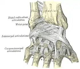 ![]() أربطة المعصم ، نظرة خلفية. أربطة المعصم ، نظرة خلفية. | |