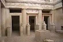 بها سلم محفور في الصخر يؤدي إلى فناء هذه المقبرة .. والفناء مربع الشكل والجانب الجنوبي لهذا الفناء تشغله واجهة بها عمودان .. يليها حجرة على كل جانب من جانبيها الأيمن والأيسر فتحتان كل منهما تحوي مقبرتين الواحدة تعلو الأخرى .. والحجرة الثانية بمثابة صالة لإقامة الصلوات وبها مصطبتين كبيرتين حفرت فوق كل منهما عدة فتحات للدفن .. وفي نهاية هذه الحجرة حجرة صغيرة وجد بداخلها مائدة كانت تقدم عليها القرابين .. وقد بنيت من قطع حجرية وكسيت بطبقة من الجص وبألوان تشبه الرخام.. وفي نهاية هذه الحجرة يوجد بقايا السرير الجنائزي .. ولا يزال على الإفريز العلوي للسرير مسمار من النحاس كانت تعلق به أكاليل الزهور وهناك حجرة في الجزء الغربي من الفناء بها تابوت على هيئة سرير عليه رسومات بألوان زاهية جميلة تمثل سيدات وزهور وعربات يقودها آلهة الحب .. وفي الجانب الشمالي الغربي حجرة صغيرة بها بئر .