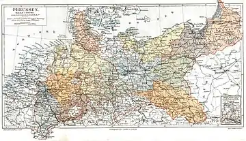 تم تقسيم الدولة البروسية في البداية إلى عشر مقاطعات. عينت الحكومة البروسية رؤساء كل مقاطعة معروفة باسم Oberpräsident (أي المفوض السامي). مثل Oberpräsident الحكومة البروسية في المقاطعة، وكان مشغولا بتنفيذ والإشراف على الصلاحيات المركزية للحكومة البروسية. تم تقسيم مقاطعات بروسيا إلى مناطق حكومية ( Regierungsbezirke )، تخضع للمفوض السامي. وفيما يتعلق بالحكم الذاتي، كان لكل مقاطعة أيضًا نظام غذائي للمقاطعات ( Provinziallandtag باللغة الألمانية)، تم انتخاب أعضائه في انتخابات غير مباشرة من قِبل مستشاري المقاطعات ومستشاري المدن في المقاطعات الريفية التأسيسية والمدن المستقلة.