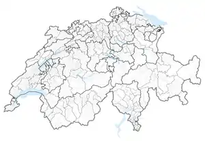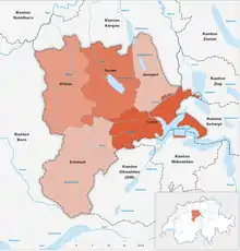تتكون سويسرا من 26 كانتونا وكل كانتون له الحرية الكاملة في اختيار التنظيم الداخلي الخاص به.[1] لهذا توجد مجموعة متنوعة من الهياكل والمصطلحات للتقسيمات الإدارية لكل من الكانتون والبلدية. وتنقسم معظم الكانتونات إلى مقاطعات (بالألمانية: Bezirke) وكل مقاطعة مقسمة إلى بلديات وقرى.