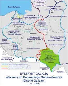 تتألف مقاطعة غاليسيا أساسًا من فويفود قبل الحرب في الجمهورية البولندية الثانية، والتي أصبحت اليوم جزءًا من غرب أوكرانيا . استولت ألمانيا النازية على الأراضي في عام 1941 بعد الهجوم على الاتحاد السوفياتي ودمجت في الحكومة العامة، التي يحكمها غوليتر هانز فرانك منذ غزو عام 1939. استولى الاتحاد السوفيتي على المنطقة مرة أخرى في عام 1944.