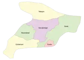 | القسم المركزي | كرج · ماهدشت · مشكين دشت · كمال شهر · محمد شهر · كرمدره | كرم دره · محمد آباد · كمال آباد |