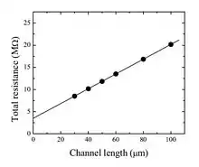 وفي حين أن و عبارة عن مقاومات تلامسية وملامسات قناة، وعلى وجه الخصوص الذي يعد طول أو عرض القناة, هو سعة عازل البوابة (لكل وحدة في المنطقة)، هو الحركة الناقلة و و هو بوابة المصدر والجهد الكهربي لمصدر المنبع. ولذلك، فإن الاستكمال الخارجي الخطي لإجمالي المقاومة لطول القناة الخالي يوفر المقاومة التلامسية. يتعلق انحدار الدالة الخطية المواصلة التبادلية للقناة ويمكن استخدامها لتحرك ناقل "المقاومة الخالية التلامسية" تؤدي التقريبات المستخدمة هنا (هبوط الجهد الخطي بواسطة منطقة القناة والمقاومة التلامسية الثابتة و...) في بعض الأحيان إلى المقاومة التلامسية التابعة للقناة resistance.[2]