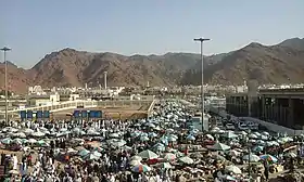 ![]() مقبرة شهداء أحد (داخل السور) كما تبدو من أعلى جبل الرماة. في الخلفية يظهر جبل أحد | |