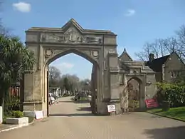 ![]() بوابة جوقية قديمة مدخل المقبرة, صُممت بواسطة السير ويليام تيت | |