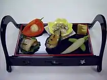 ومن القواعد غير المكتوبة أيضًا أن الأطباق التي يتم تقديمها كمقبلات لا تعطي أي فكرة عن الوجبة الرئيسية. [43] يتم تقديمها مع قائمة الوجبات الرئيسية إما في درجات حرارة الغرفة أو درجة حرارة الغرفة الباردة ؛ عند تقديمها ساخنة ، يتم إخراجها بعد وصول جميع الضيوف حتى يتذوق الجميع الأطباق.